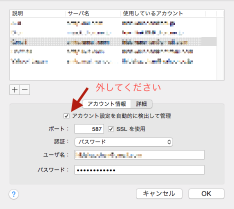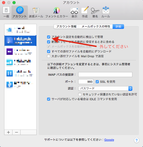 メール -> 環境設定 からアカウントのタブ -> 指定のメールを左側で選択して詳細のタブを選択。下記のチェックをはずします。私はこのgoogleのアドレスでは問題無いので外していません。矢印が解りにくいですね「アカウント設定を自動に検出して管理」のチェックを外します。