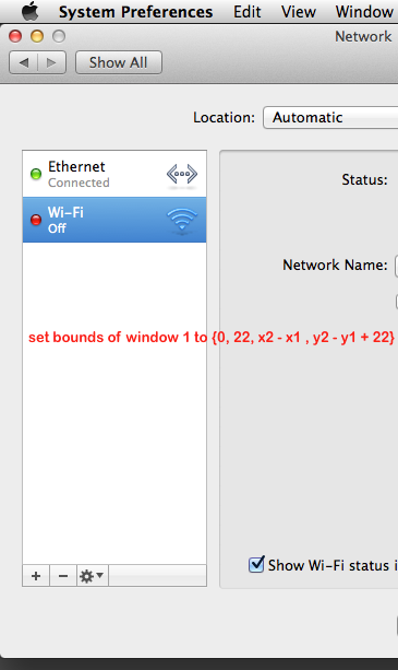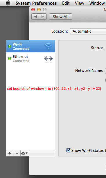 #!/bin/bash osascript <<'OSA' tell application "System Preferences" activate set current pane to pane "com.apple.preference.network" set {x1, y1, x2, y2} to bounds of window 1 set bounds of window 1 to {0, 22, x2 - x1, y2 - y1 + 22} end tell OSA