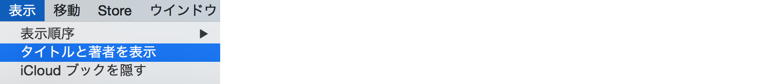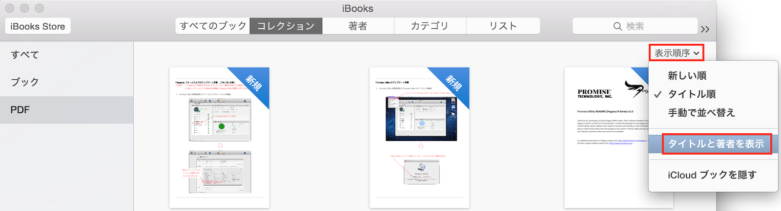 その場合は、「表示」メニュー >「タイトルと著者を表示」を選択するか、「iBooks」ウインドウ右上の