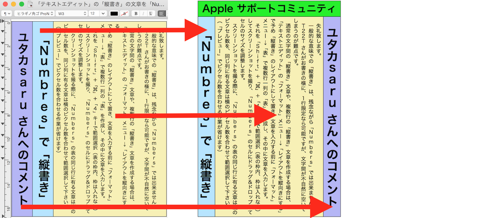 通常の文字間の「縦書き」文章や、複数行の「縦書き」文章を作成する場合は、「テキストエディット」の