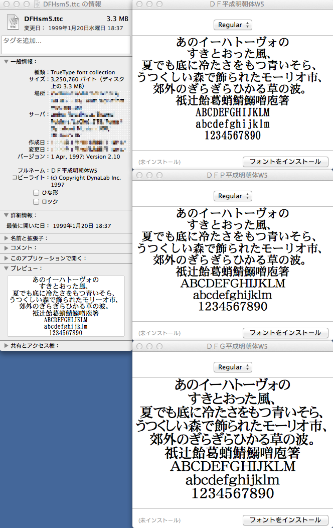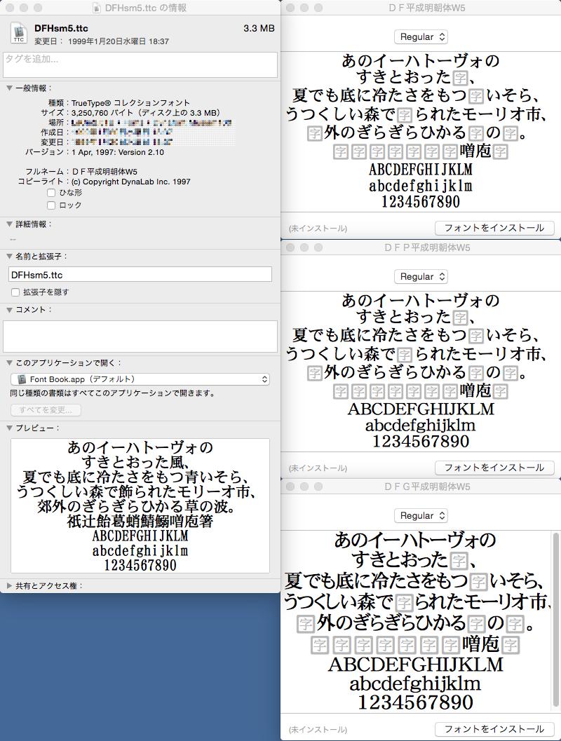 1.YosemiteでDFHsm5.ttc(平成明朝体W5)を(インストールしてません)表示したスクリーンショットになります。