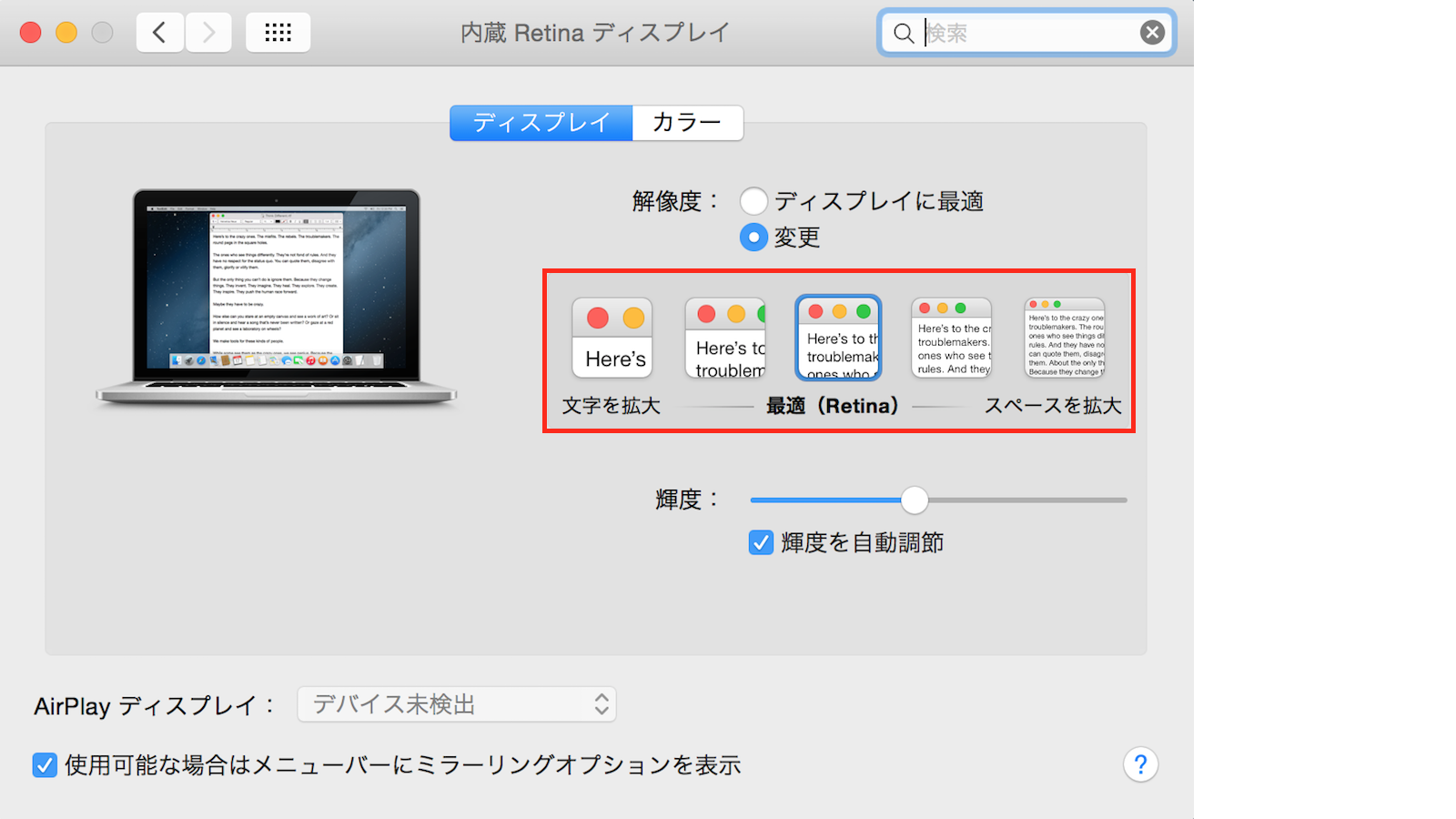 恥ずかしながら、外付けディスプレイでも 4K ディスプレイの場合、ミラーリング時以外にも「スケーリング解像度」の