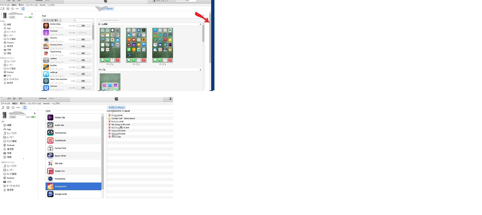 そこでitunesブラウザの外側ボタンで 下に移動し 真ん中の窓で ファイル共有APP群の中のガレーバンドを選びます