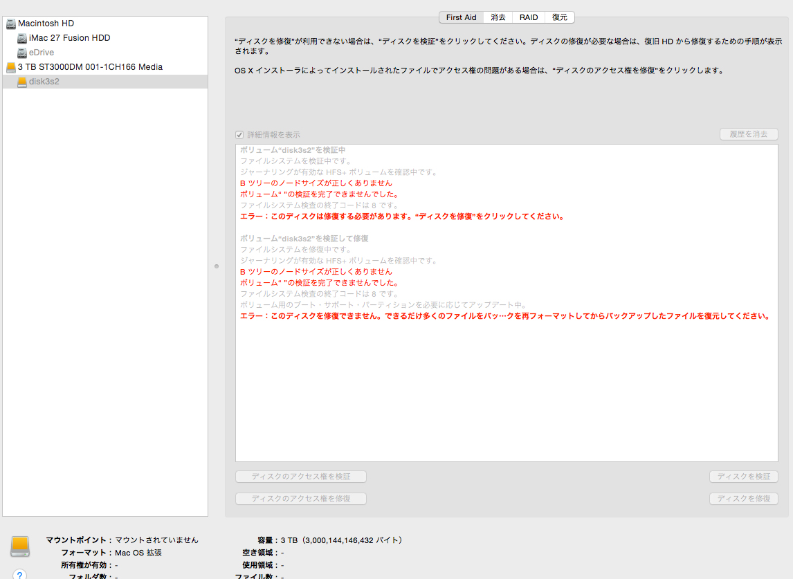 本日、外付け3TB HDD(disk3s2)の電源入れるもマウントしないため、ディスクユーティリティでディスク検証、修復するも、下記エラーでお手上げです。