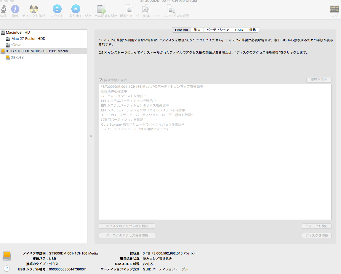 本日、外付け3TB HDDの電源入れるもマウントしないため、ディスクユーティリティでディスク検証、修復するも、上記エラーでお手上げです。