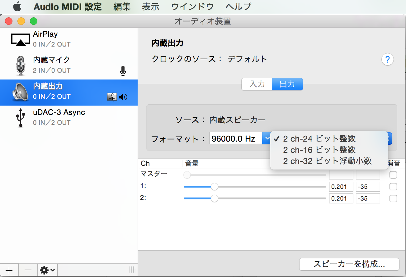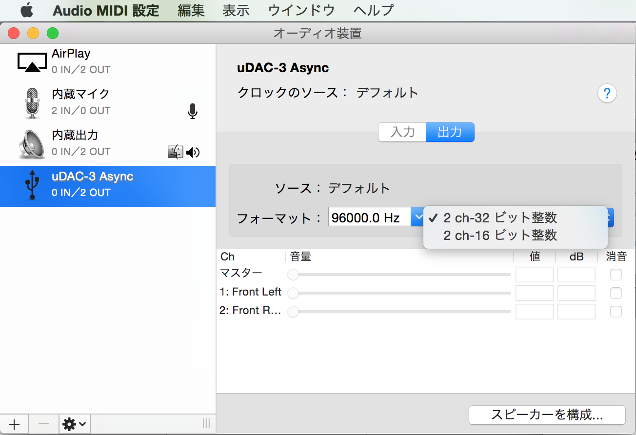Audio MIDIをチェックしましたが、正しくDAコンバーターは認識しました。MIDIの認識するソースフォーマットについても24ビット、16ビットの双方を試しましたが結果的に同じです。
