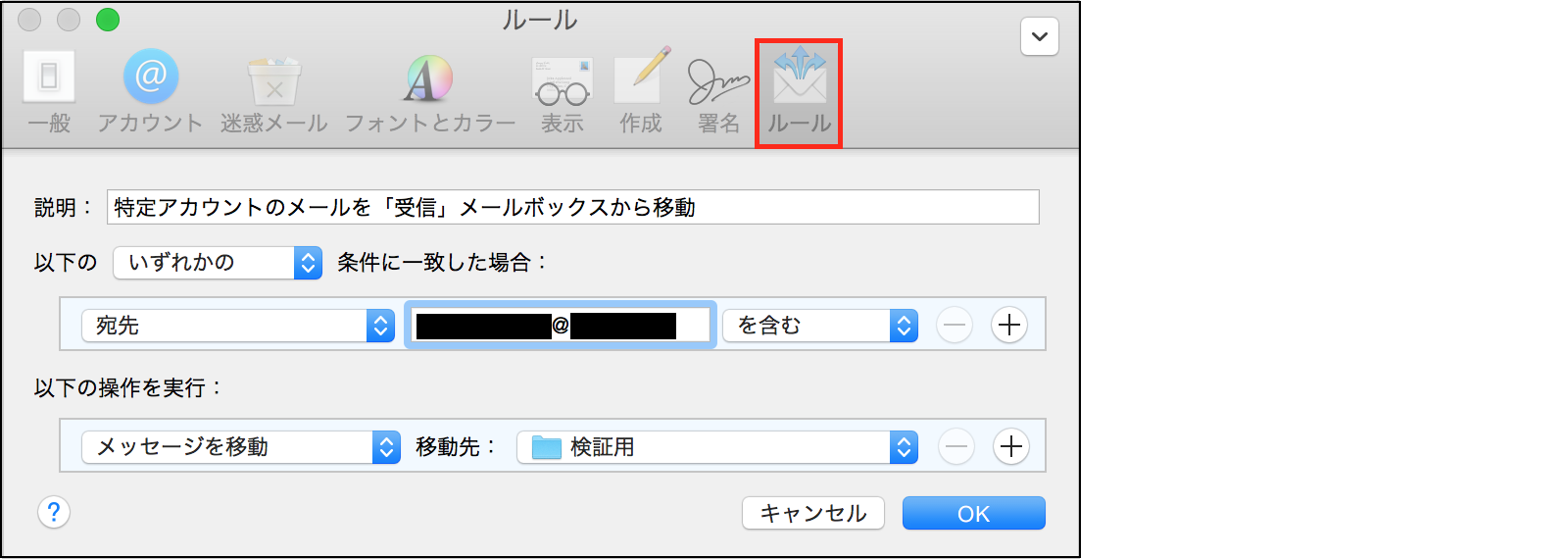 ・移動先が別々なら、C 〜 J のメールアカウント(8 個)分の「ルール」を作成して設定します。