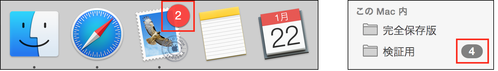 これで「Dock」上の「メール」アイコンには A と B の未読受信メール数のバッチのみが表示されますので、通知音と