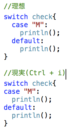Xcode 6.1.1でSwiftの勉強をしていて気がついたのですが、Switch文を書いた後にオートインデント(⌘+i)を行うとcaseやdefaultの前にあるタブやスペースが詰まってしまいます。(画像参照)