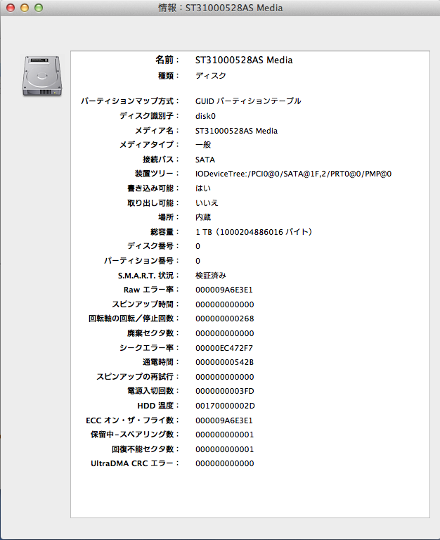さらに、回復不能セクタも1になっていますから、記録ディスク面上にも読み書き不能部分が出来ていますから、そのHDDは初期化したとしても安心して使用する事は出来ません。