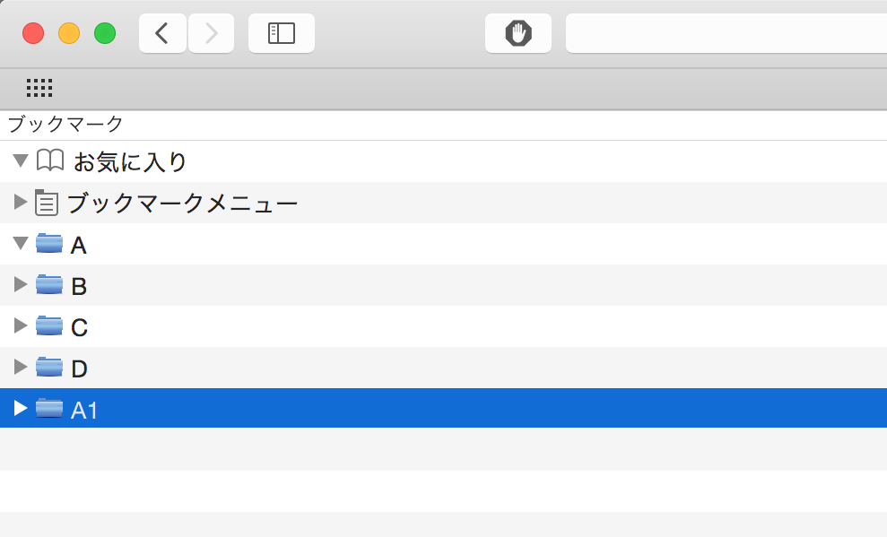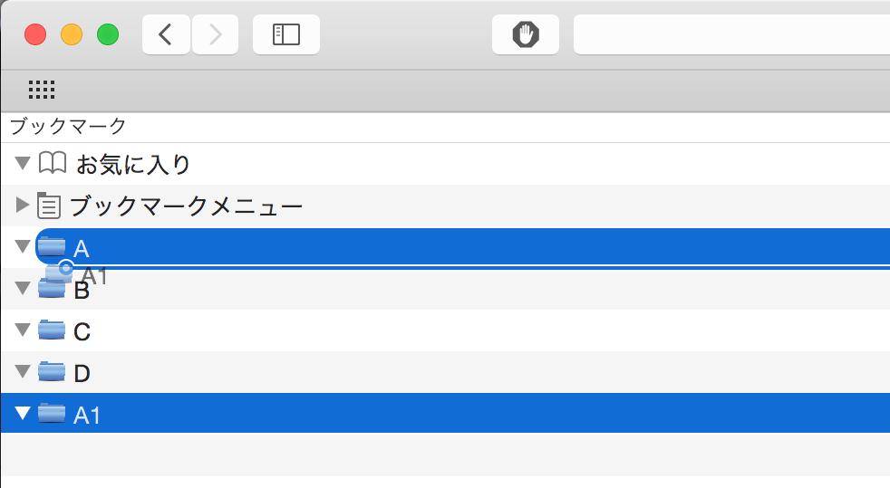 この様なブックマークがあった場合、AとBの間にA1を入れたいのですが、どの様な操作をしたら良いのでしょうか?commandキーやoptionキーなどを勘で押してみても・・・違う機能ですし・・・。