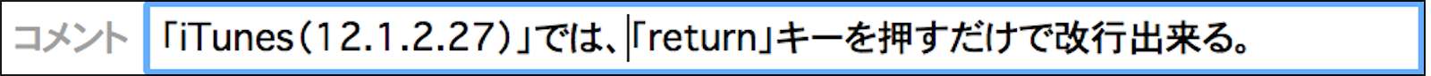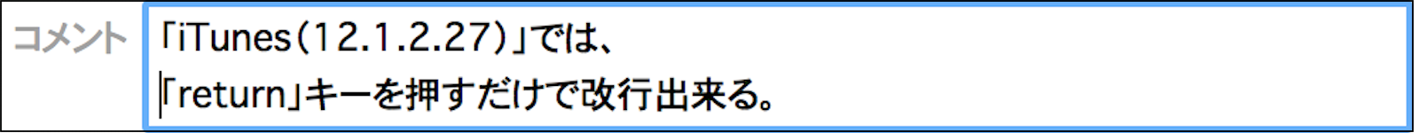 ちなみに、「iTunes(12.1.2.27)」の「コメント」欄でのキー操作の挙動は、下記の様になっていますね。