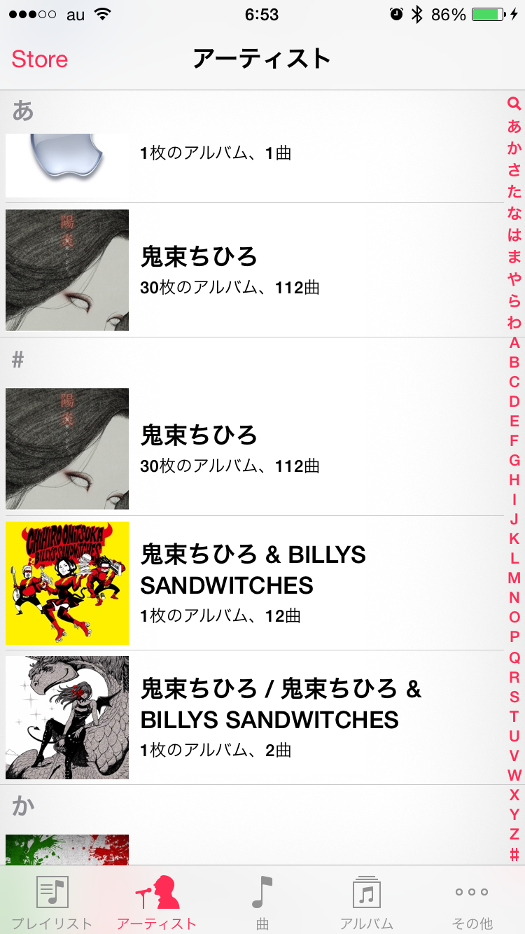 続く「鬼束ちひろ & BILLYS〜」「鬼束ちひろ / 〜」も同様に「#」となっていますが、これも「あ」に入るべきです。