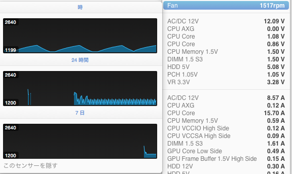 今日は寒いので、何回ベンチマークをしてもCPUコアが70度ぐらいまでしか上がりませんが、それでもファンは知らん顔で1600台で回っています。