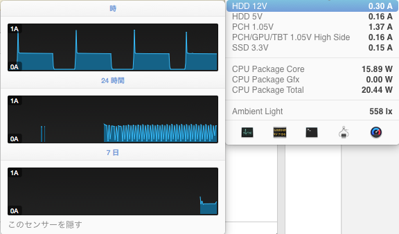 上のグラフでは、1400にボコッと凹んでいるところがありますが、この間とくにMacを操作していたわけでもなく、下がってまたかってに上がり始めたような感じです。