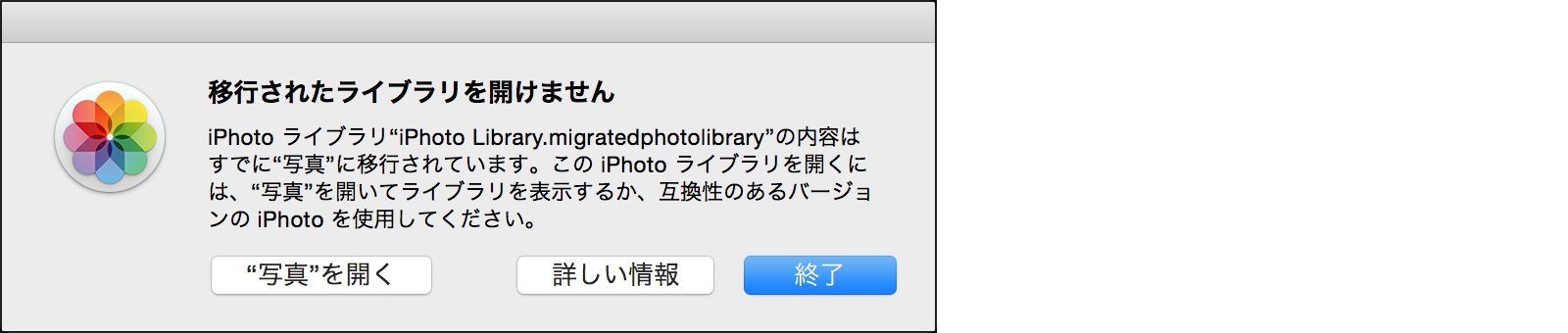 理由を探すと、Photosへの以降に際してファイル名は同じで拡張子が異なる「ABC.photoslibrary」と「ABC.migratedphotolibrary」が出来ておりました。