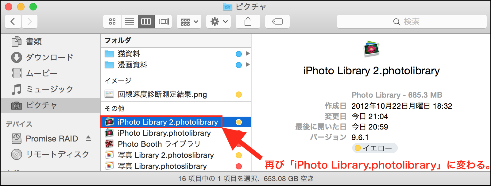 理由を探すと、Photosへの以降に際してファイル名は同じで拡張子が異なる「ABC.photoslibrary」と「ABC.migratedphotolibrary」が出来ておりました。