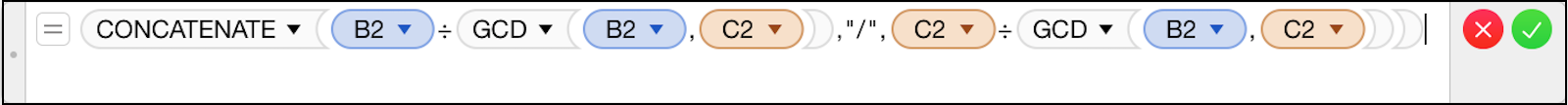 失礼致します。 GCD関数を使って分子と分母のそれぞれの値を割ってやると約分した形で表示できると思います。 分子の場合は、B2/GCD(B2,C2)、分母の場合は、C2/GCD(B2,C2)、としておくとよいと思います。