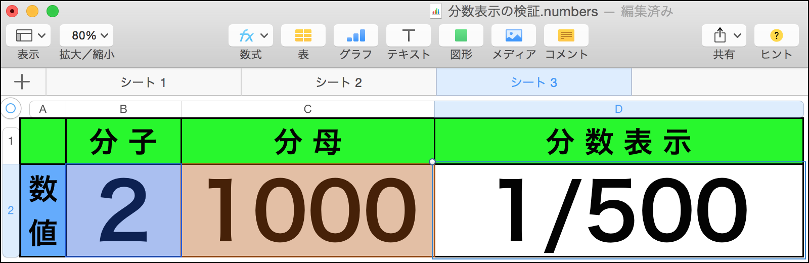 但し、最初に書きました様に、「分子」のセルを「2」に変更しても「2/1000」と表示されるだけで、「1/500」
