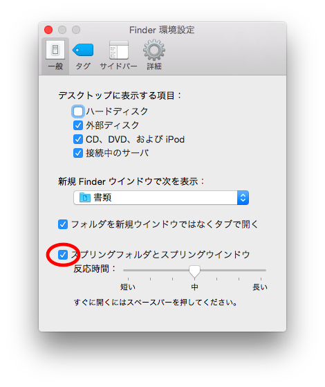 「Finder」の「環境設定」で「スプリングフォルダとスプリングウインドウ」の項目が無い事もそうですが、それ以前に