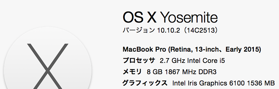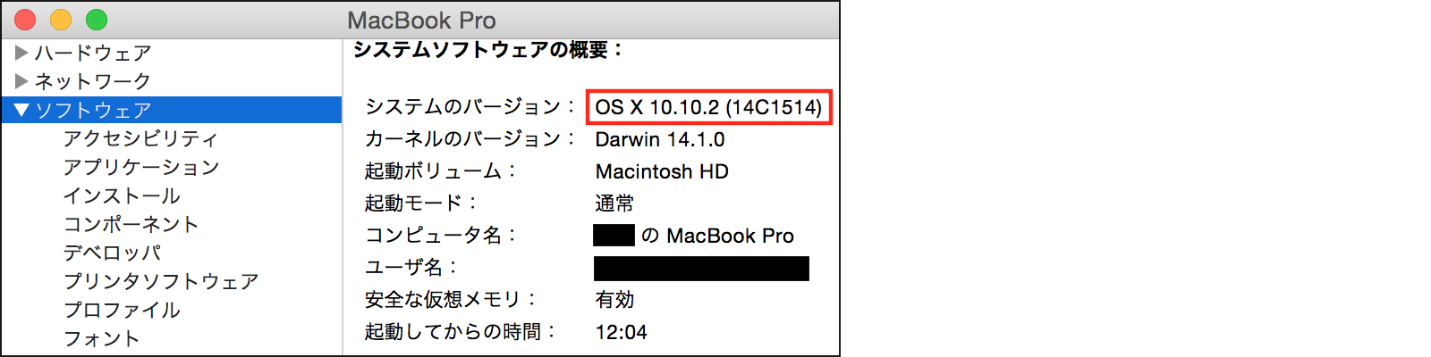「システム情報」>「ソフトウェア」>「システムのバージョン」で確認すると、同じ OS X Yosemite 10.10.2 でも、