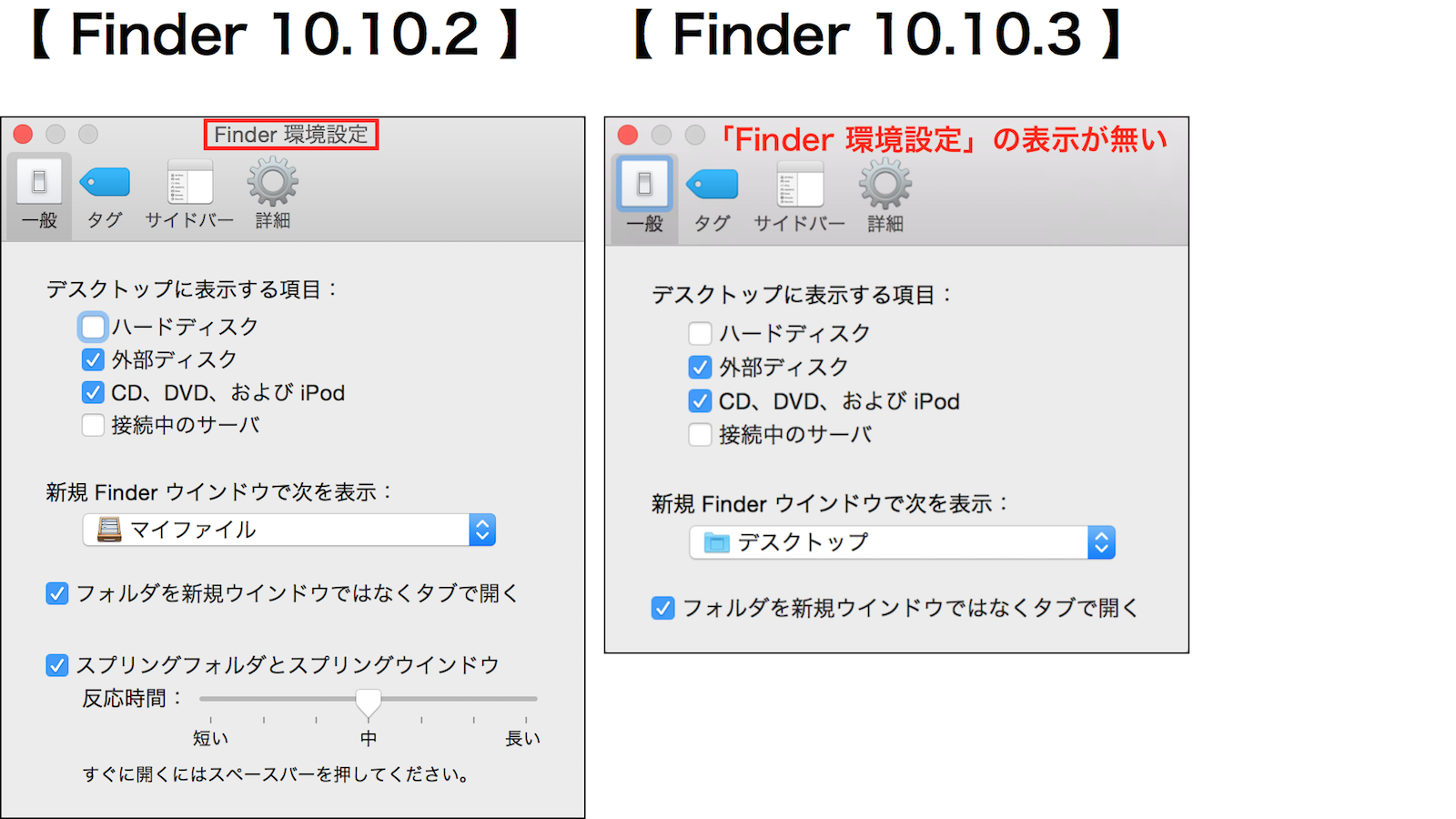「Finder」の「環境設定」ウインドウに、「Finder 環境設定」の表示が無い事自体おかしいですね。