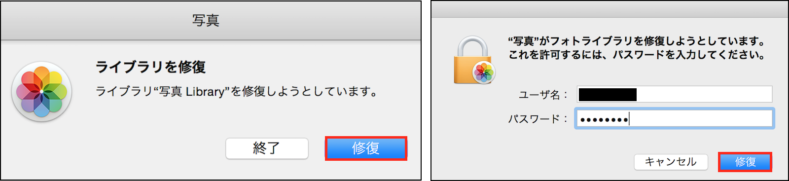 キーを押しながらダブルクリックして、「写真 Library.photoslibrary」を修復して見て下さい。
