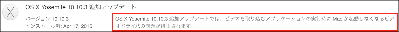 Mac が起動しなくなるビデオドライバの問題が修正されます」と言う事ですが、このアップデートを適用して見ては如何
