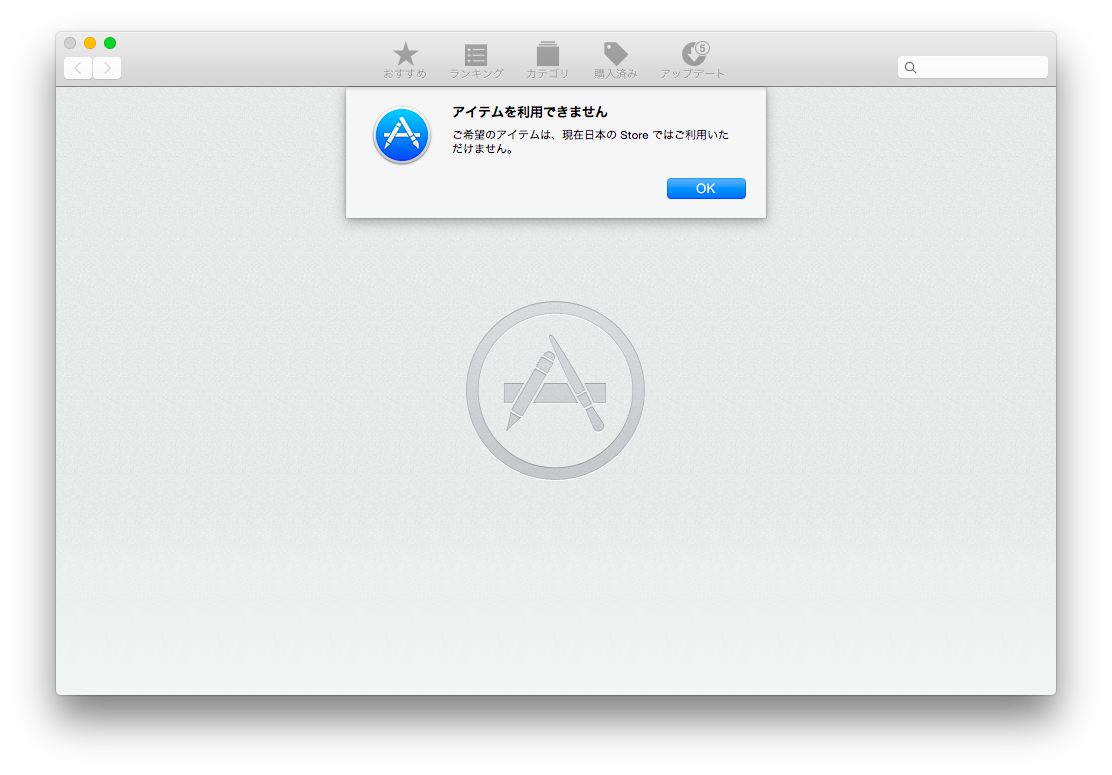 App Store で検索をクリックするとアイテムを利用できませんと出ます。