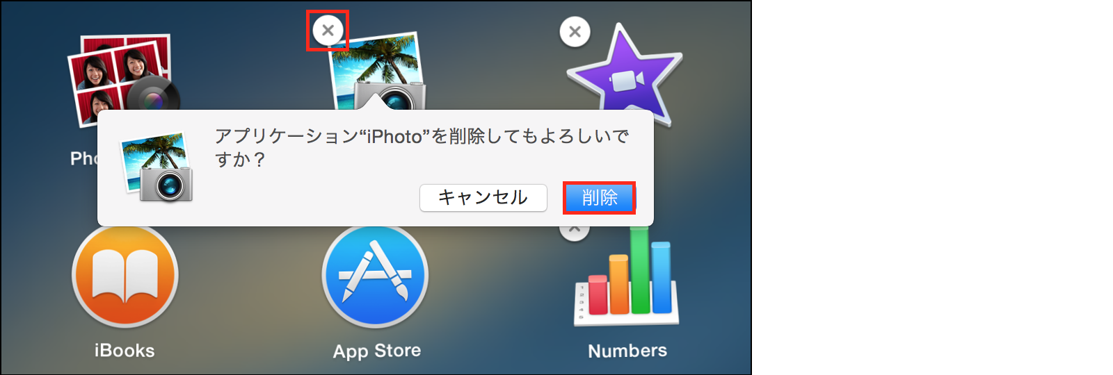 「iPhoto」アイコンをクリックし続けると、アイコンが揺れ出し「⨂」マークが表示されますので、それをクリック