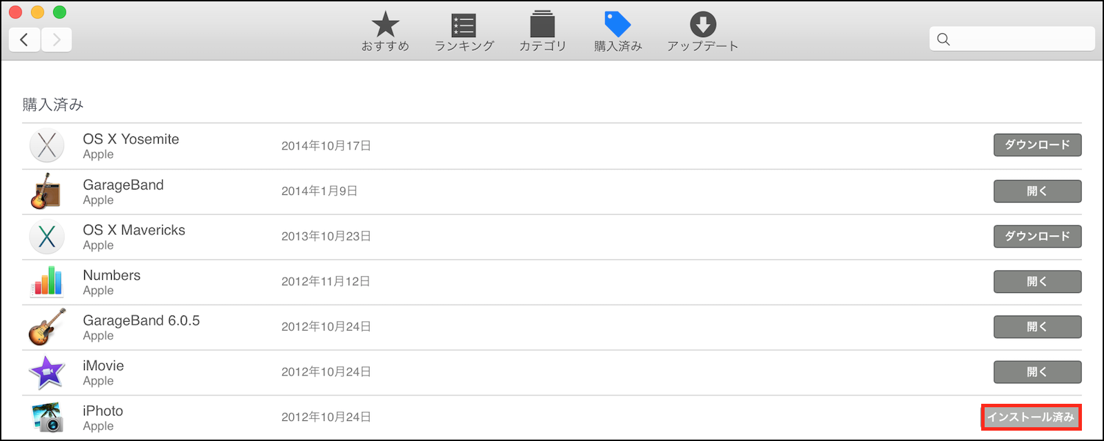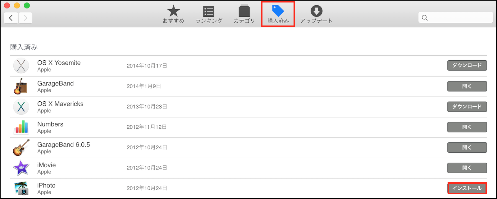 「iPhoto」を削除すると、「App Store」の「購入済み」タブの「iPhoto」の表示が、「インストール」に変わりますので、