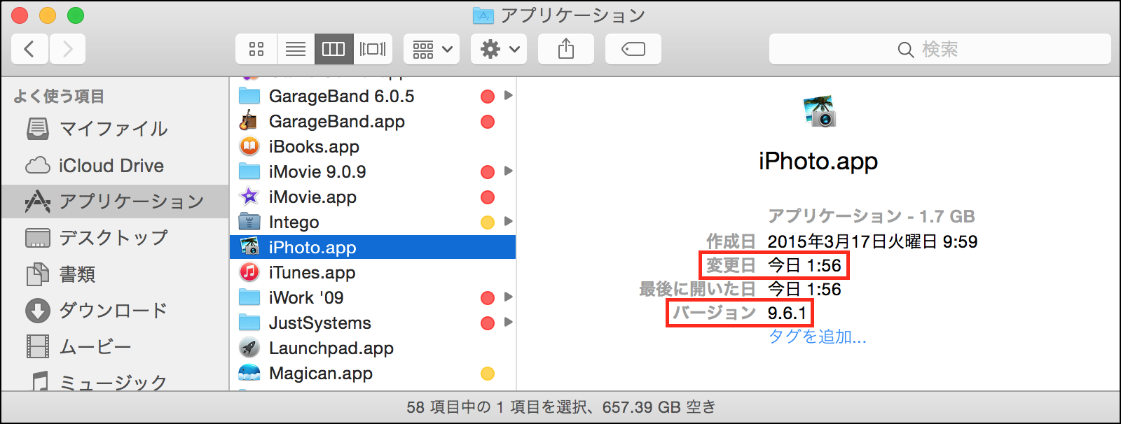 「iPhoto」のバージョンが「iPhoto(9.6.1)」になっている事を確認したら、起動して見て下さい。
