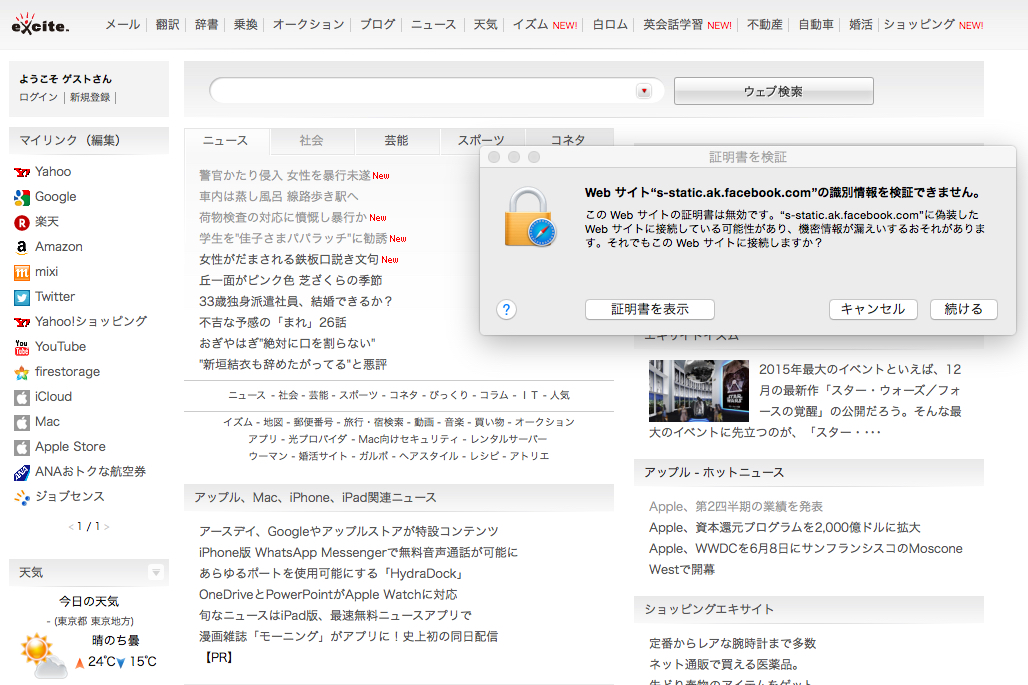 キャンセルして証明書の検証は終了しました、ホームページの入ーすタブの反転しているニュースは問題なく閲覧できています。