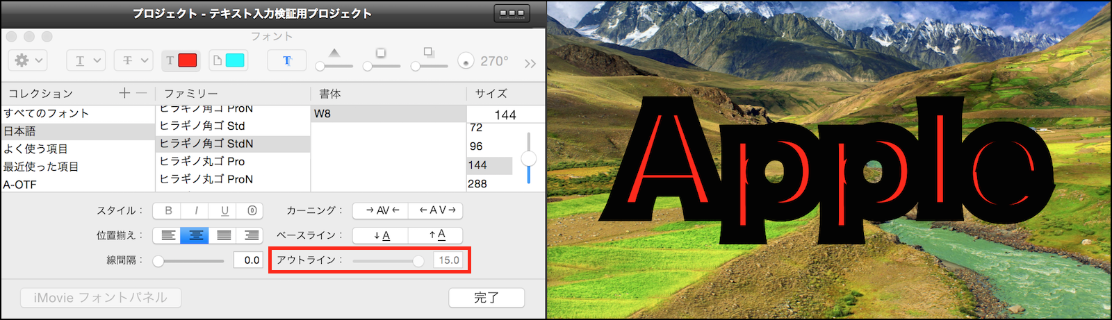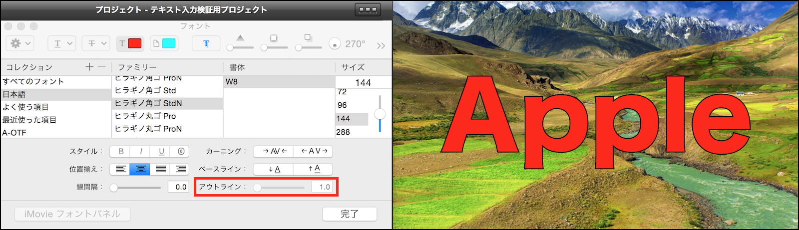 しかし、少なくとも「iMovie(10.0.8)」では、「フォントパネル」にアウトラインのライン幅の設定自体が無く、