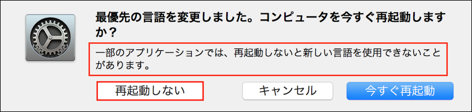 優先言語を英語、追加で日本語を使うようにしているのですが、優先言語を日本語に変えてみようとしたら、Mountain Lion まではログアウトしてログインしなおすだけでよかったのに、再起動が必要との指示がでて一寸驚きました。いま自分のアカウント(管理者)一つだけ(Guestもアクティブにしていますが)なのでこうなるのか、それとも複数のユーザがいる場合も誰かが最優先言語を変えたいときはその都度再起動しなければならないのでしょうか?