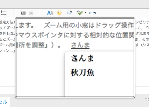 (例えば、「さんま」と入力した場合、この変換候補にあたる「さんま」が別ウィンドウで拡大され、秋刀魚やサンマが拡大されるものではありません)