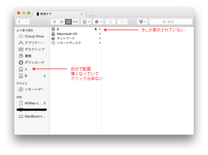 すると、なぜか普段使っていた外付けHDD(Aという名前)がFinderに表示されず、無理やり移動して「よく使う項目」にドライブを配置したのですがクリックして移動することができません。