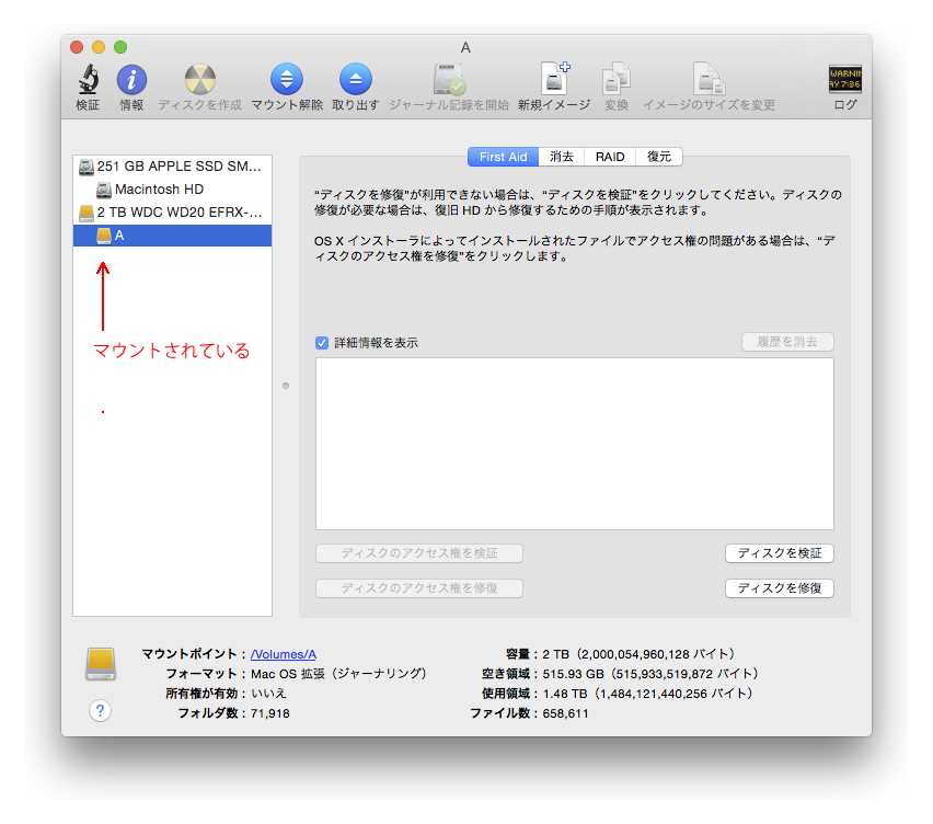 ディスクユーティリティを確認してみるとマウントはしっかりされているようです。