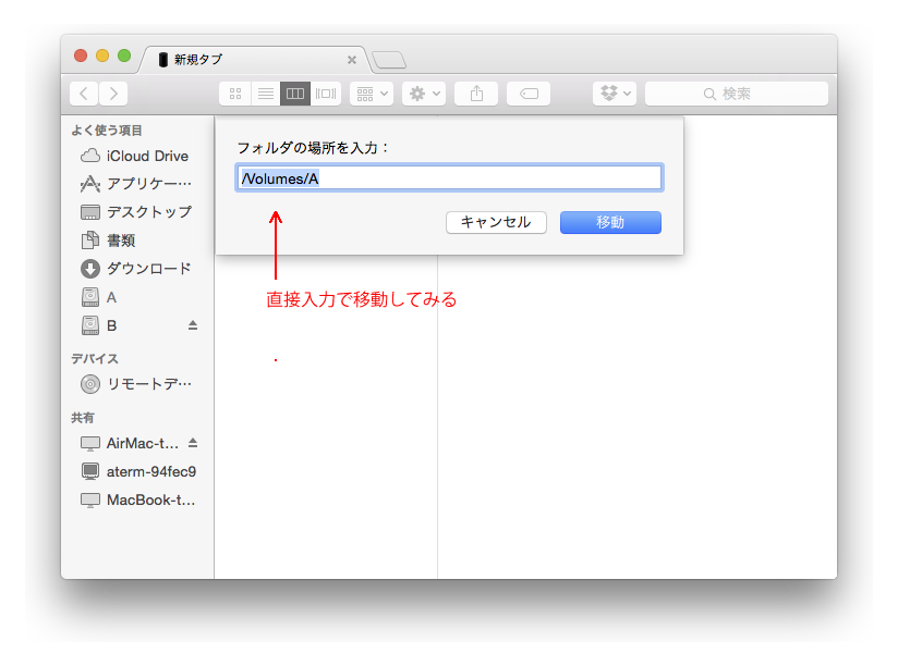 FinderからAドライブに移動するにはCmd+Shift+Gから「/Volumes/A」を入力するしかありません。