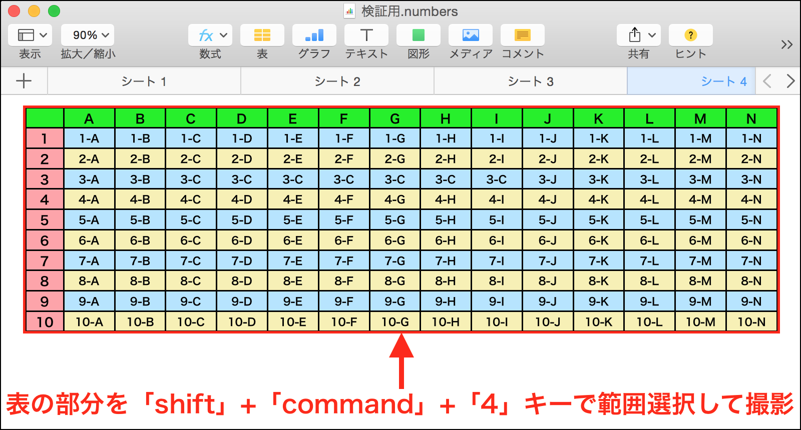 「shift」+「command」+「4」キーで「選択範囲撮影」モードにし、表の部分を範囲選択してスクリーンショットを撮影
