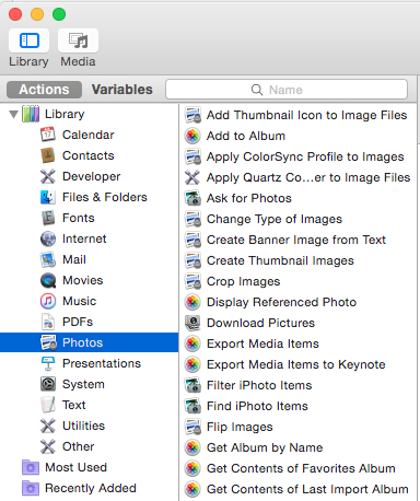 失礼致します。 Mac OS X AutomationというAppleScript.appやAutomater.appの機能を紹介する有名なサイトがあるのですが(Appleの公式のサイトではないです)、そこにある、Photos & AutomatorからPhotos.app用のアクション(ベータ版)をダウンロードできるようです。 Mac App Storeからダウンロードできるアプリケーションではないので、システム環境設定>セキュリティ&プライバシー>一般で、アプリケーションのインストールに許可を与える必要があります。また、インストール後にはAutomator.appを再起動する必要があります。
