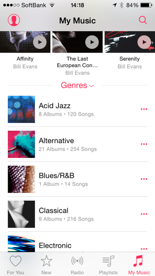 それはともかく、同じようにジャンル項目を選んでおりましたが、そのジャンルの何かを選んだとしてもアルバム分け(ジャンルの中で)がされているだけで「そのジャンル全て」をシャッフルする事はできませんでした。以前ですと下にスライドするとシャッフルマークが上に表示されて聴くことができましたが、まるきりありません・・ (^_^;