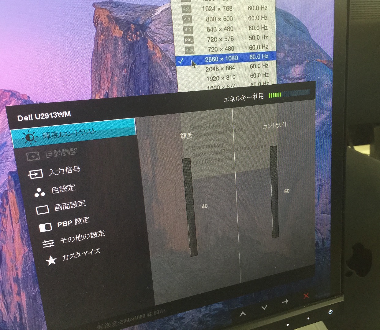 (見づらいですが、ディスプレイ認識信号も左下に 2560x1080 60Hzと表示されている)