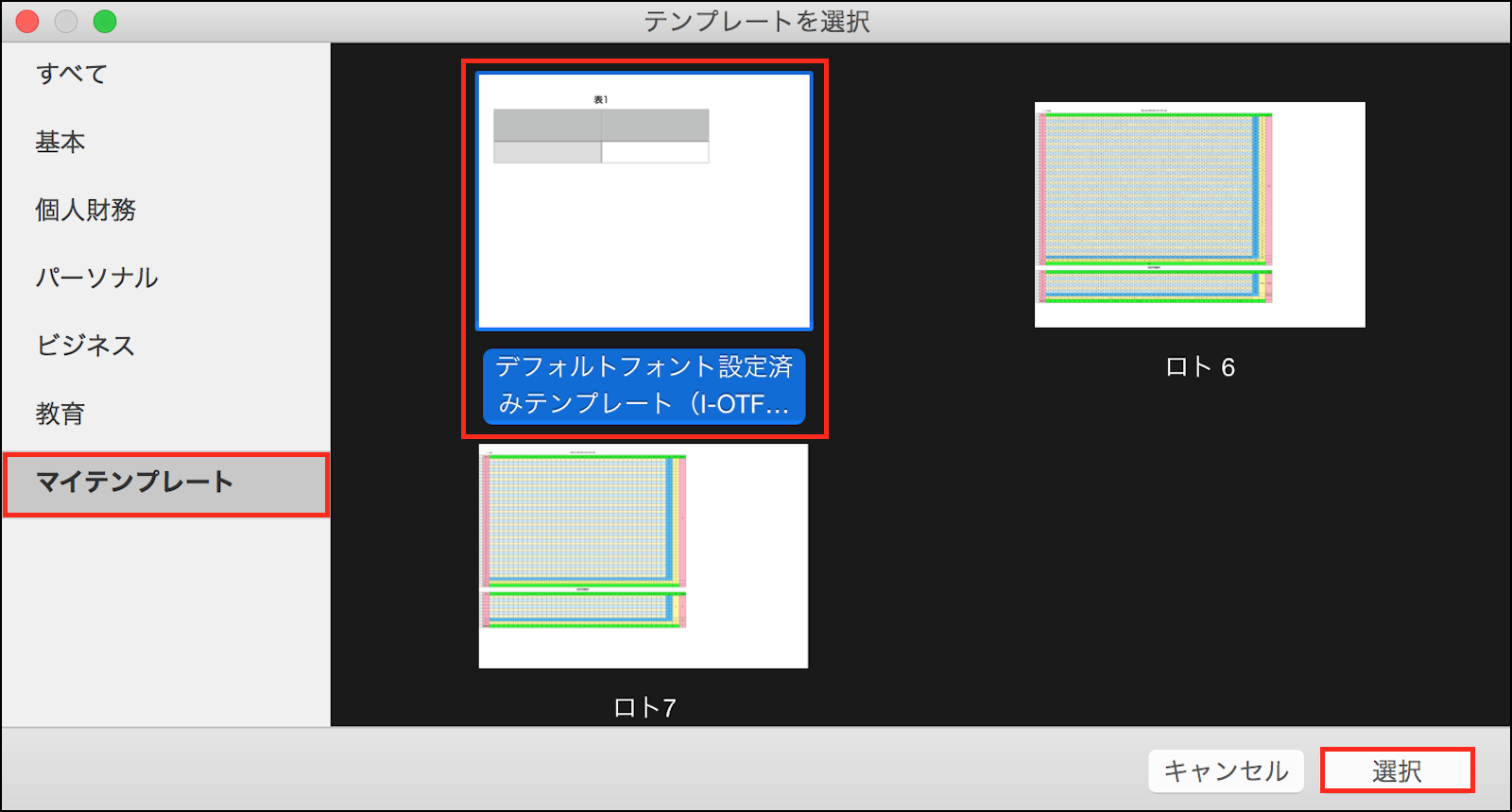 デフォルトフォントの設定を行って何もデータを入力していない状態で、「ファイル」メニュー >「テンプレートとして保存」