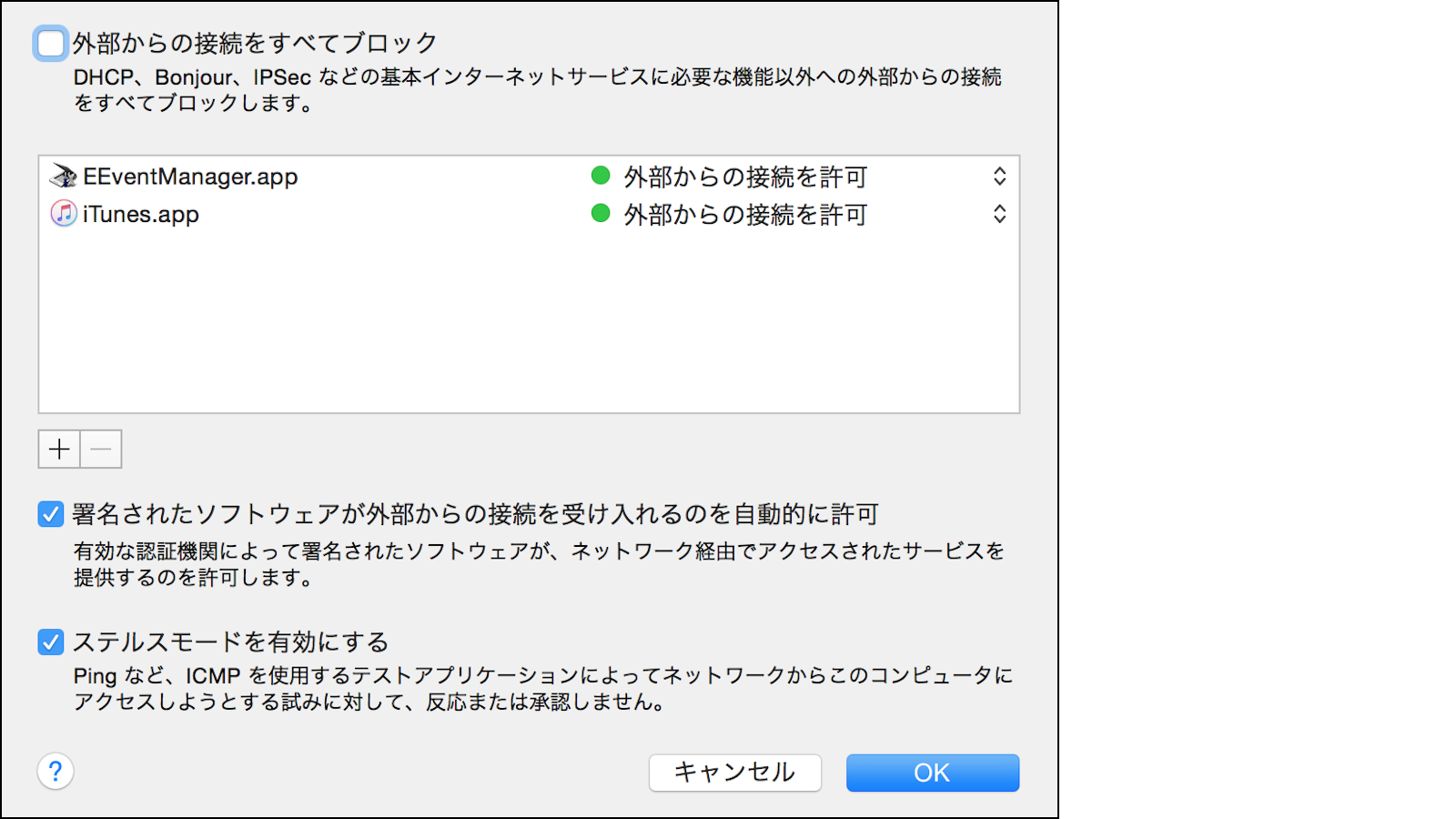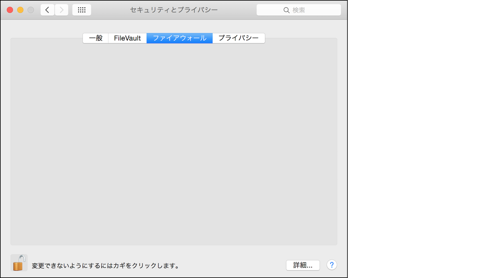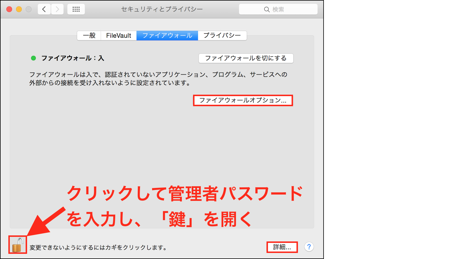 システム環境設定>セキュリティーとプライバシー>ファイアーウォール