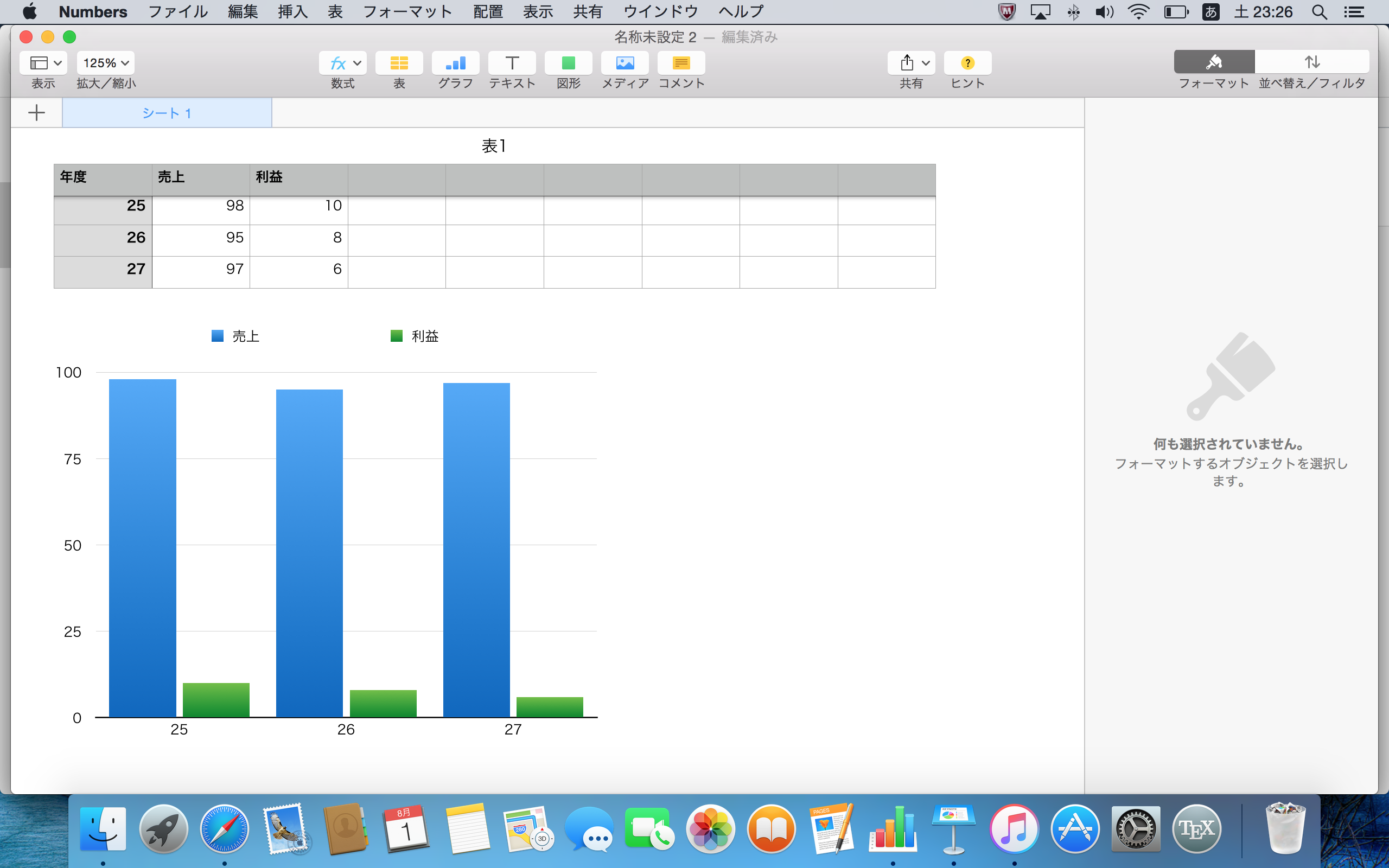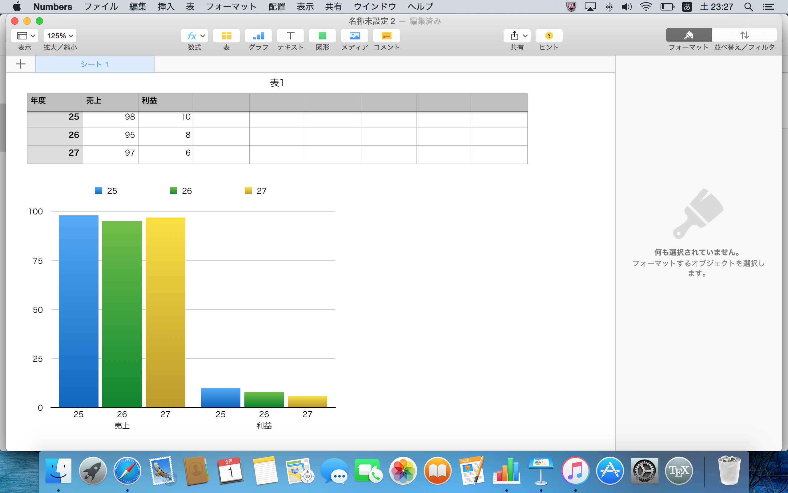 どうでしょう? 図1の場合は、横軸が年度になっているので、経年変化を理解しやすい形になっていると思います。 一方で、図2の方は、25と26年度が同じ色で、27年度だけ異なる色になっていると、凡例が表示されていない場合は、経年変化を理解しづらいですね。 その上、売上と利益とが同じスケールの縦軸を使ってプロットしてあるので、それぞれの経年変化はさらに掴みづらい形になっていると思います。
