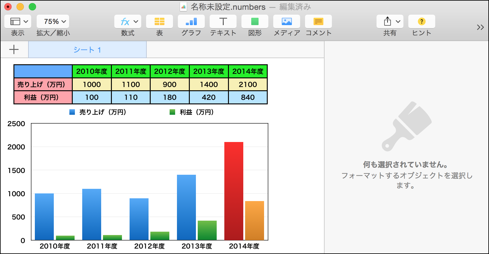 ただ、同一系列では、色が変えられないとすると、例えば年度別売上、利益を作る際に