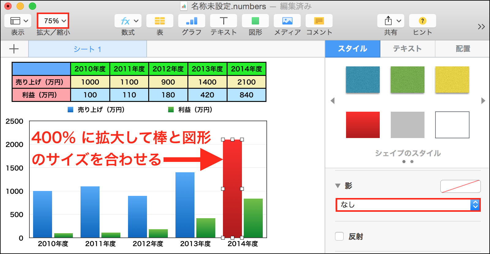 ②「拡大/縮小」で 400% に拡大し、色を変更したい棒と図形のサイズを合わせます。