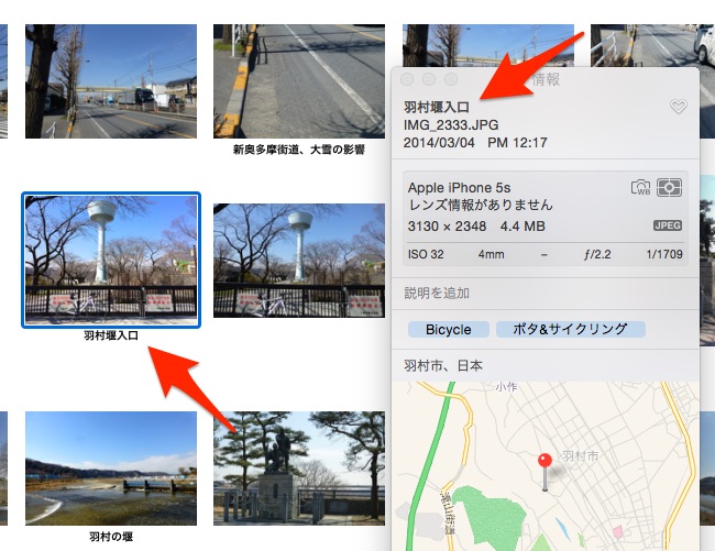 iPhotoの時は写真の下に、DSC_0286.JPG のようなタイトルが表示されていたような気がしますが、写真になって無くなった。