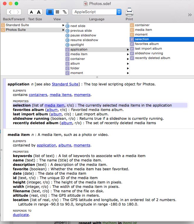 AppleScriptの写真アプリの辞書を見てみると、アプリケーションクラスに選択したメディアアイテムのリストを返すプロパティ(selection)があり、メディアアイテムのクラスには、タイトル(name)のプロパティがあるようなので、AppleScriptを使うと連番を付けることができそうです。